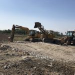 Nákladné autá na prevoz materiálu.Čelný nakladač, pásový bager, buldozér.Prevoz stavebných strojov podvalníkom.